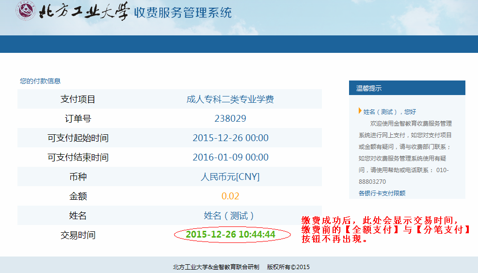 (1)请在线上付款过程中注意保护个人信息,保证个人资金安全!(不要在网吧等公用电脑上进行线上缴费操作)
