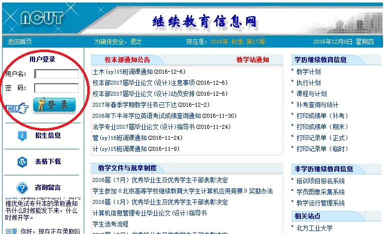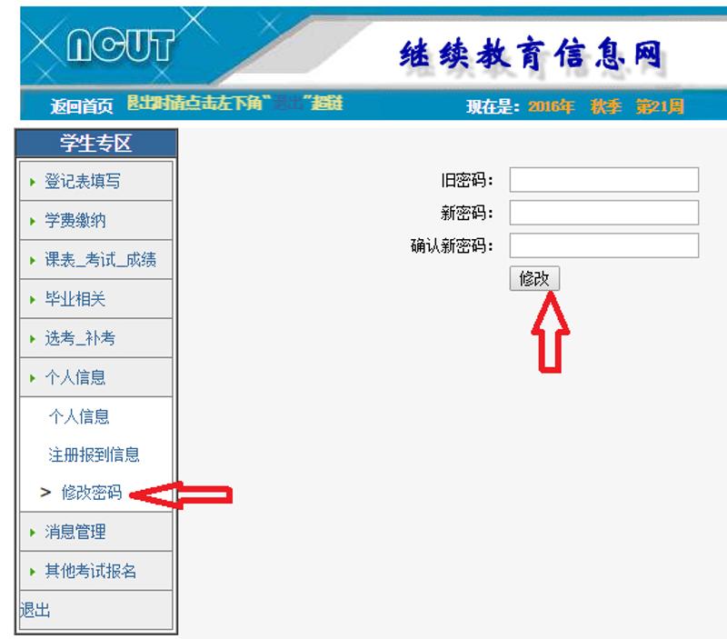 一、特别提示:继续教育信息网(http://jjxx.ncut.edu.cn/)是pg游戏官网教学综合服务平台,登陆个人账号,可查询在校期间教学通知、学期课表、考试安排、课程成绩、注册缴费、学籍变动、学业审核等各种信息。请大家登陆后首先修改密码,并妥善保管!