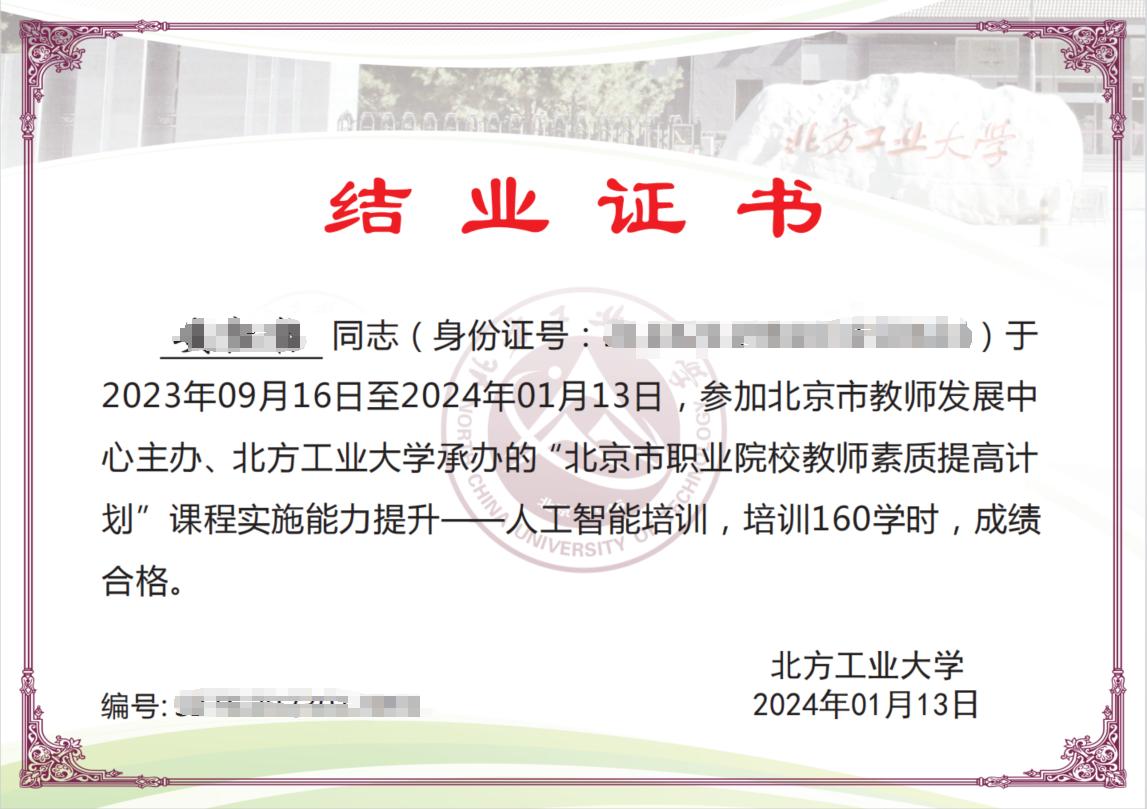根据北京职业院校教育改革发展的需要,北京市教师发展中心部署,我单位承办“北京市职业院校教师素质提高计划国培项目”,开展“课程实施能力提升——人工智能”项目培训。培训内容围绕人工智能领域核心技术与内容展开,课程内容包括前沿专家讲座、理论学习、课程思政与教学指导、竞赛与行业指导,更有产业项目实操训练、参观研讨等模块,对以上学习模块进行研讨与考核,最终为通过培训的学员发放结业证书。
