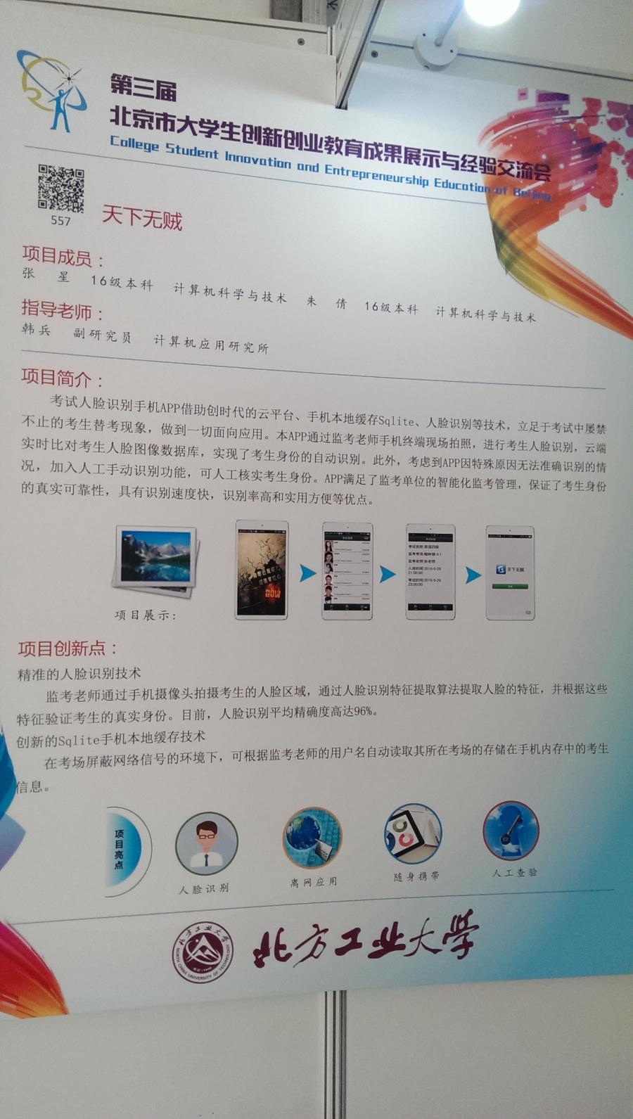 由pg游戏官网教师韩兵老师指导,pg游戏官网2016级计算机科学与技术专业学生张星、朱倩研发的“天下无贼”——考试人脸识别手机APP项目应邀参加此次展出。前来参观的部分师生对此项目产生了兴趣,并在现场进行了亲身体验。此次参展展示了pg游戏官网澳门电子pg游戏官网学生的计算机设计应用水平,对广大在校生产生了鼓舞作用。此前该项目已荣获2016年北京高等学校继续教育大学生计算机设计应用竞赛二等奖。
